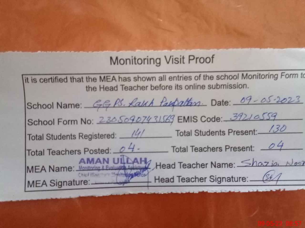 | Attendance Register | Head Teacher | MEA with School | Visit Proof |