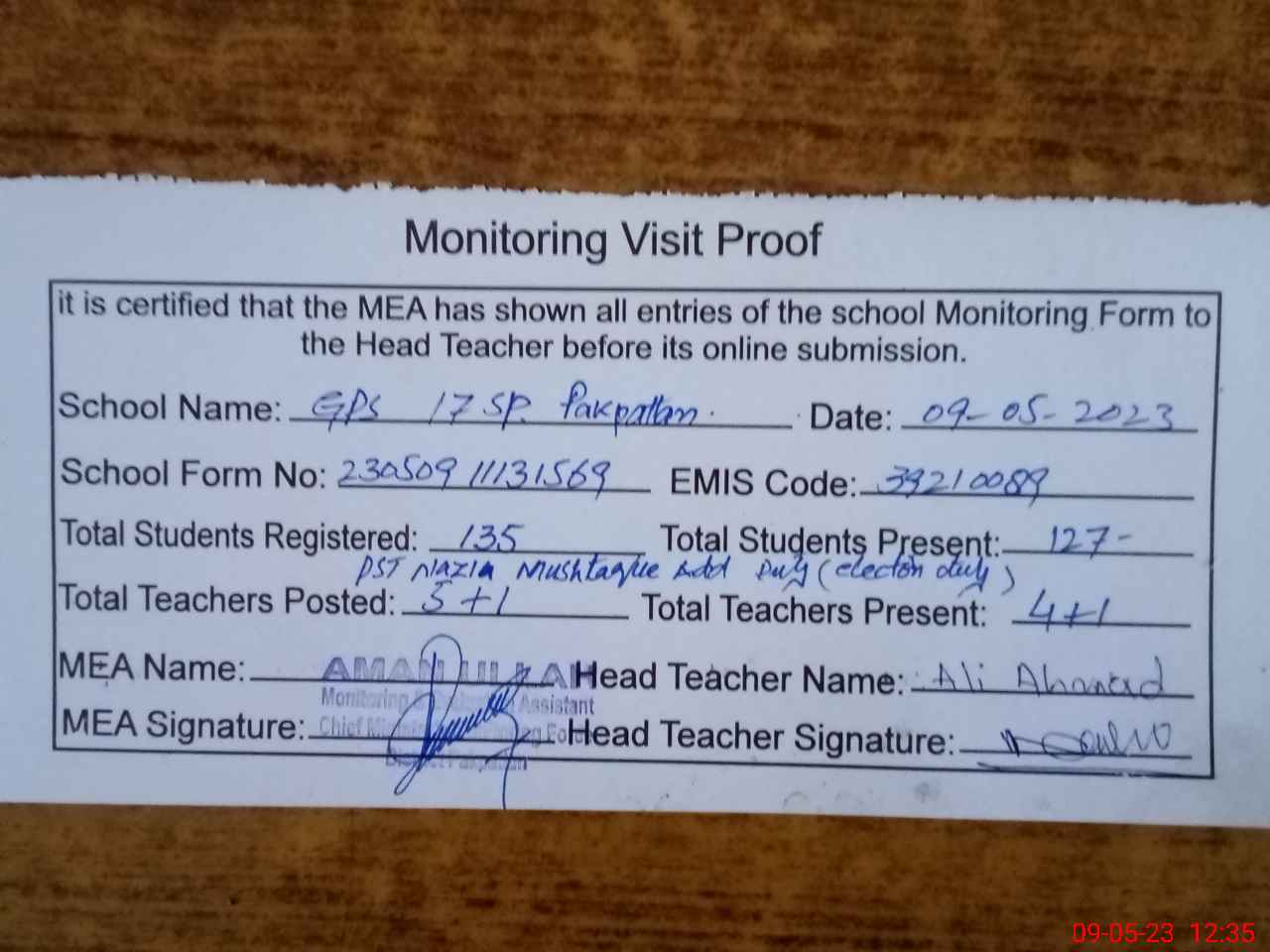 | Attendance Register | Head Teacher | MEA with School | Visit Proof |