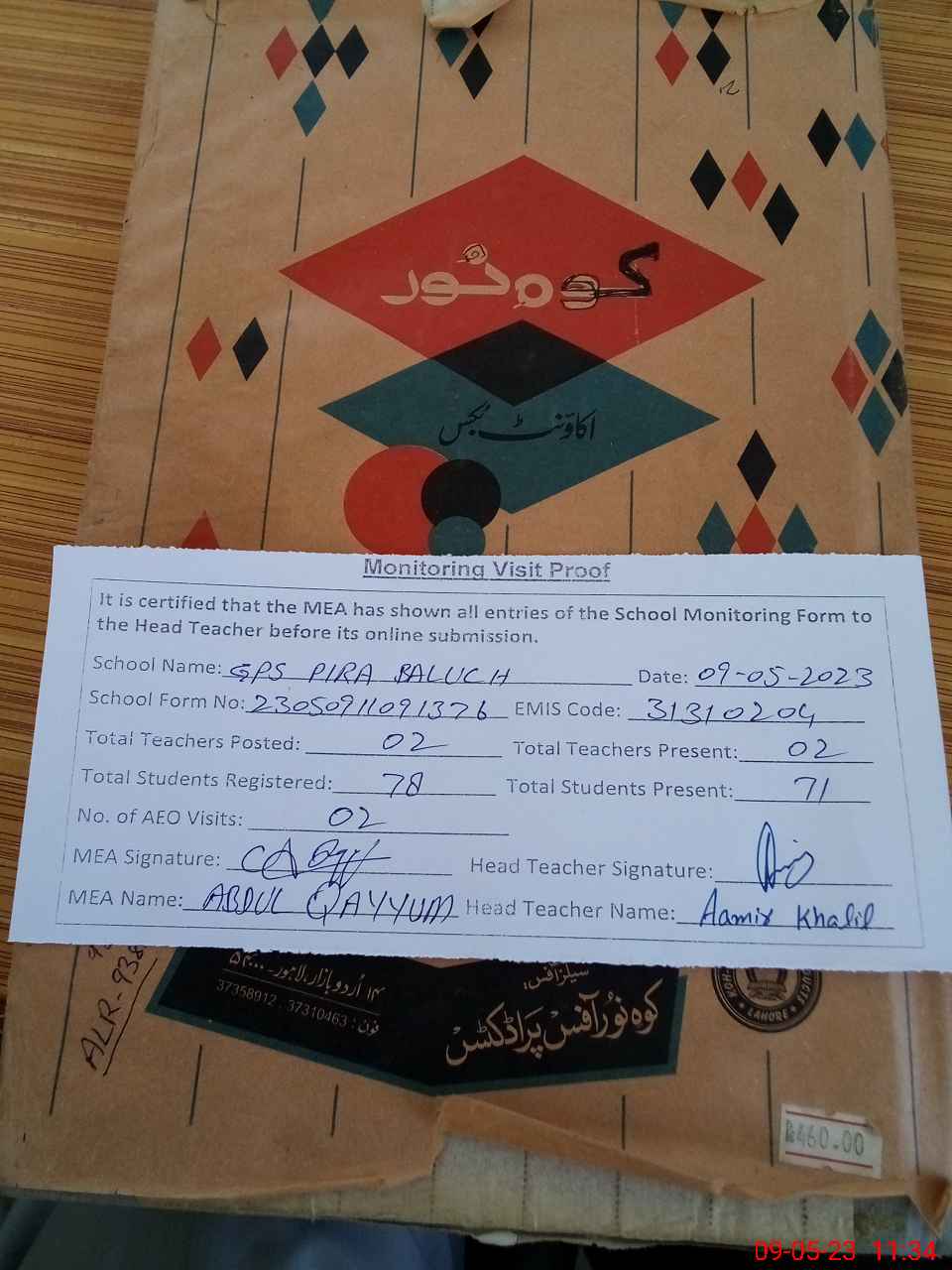 | Attendance Register | Head Teacher | MEA with School | Visit Proof |
