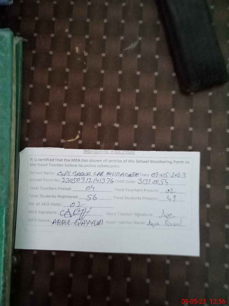 | Attendance Register | Head Teacher | MEA with School | Visit Proof |