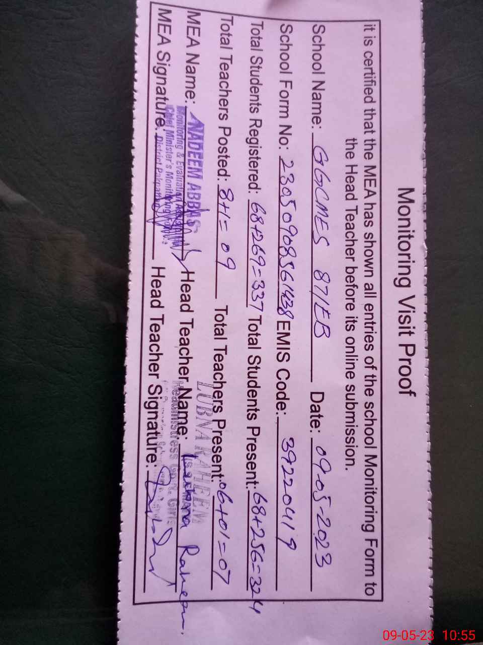 | Attendance Register | Head Teacher | MEA with School | Visit Proof |
