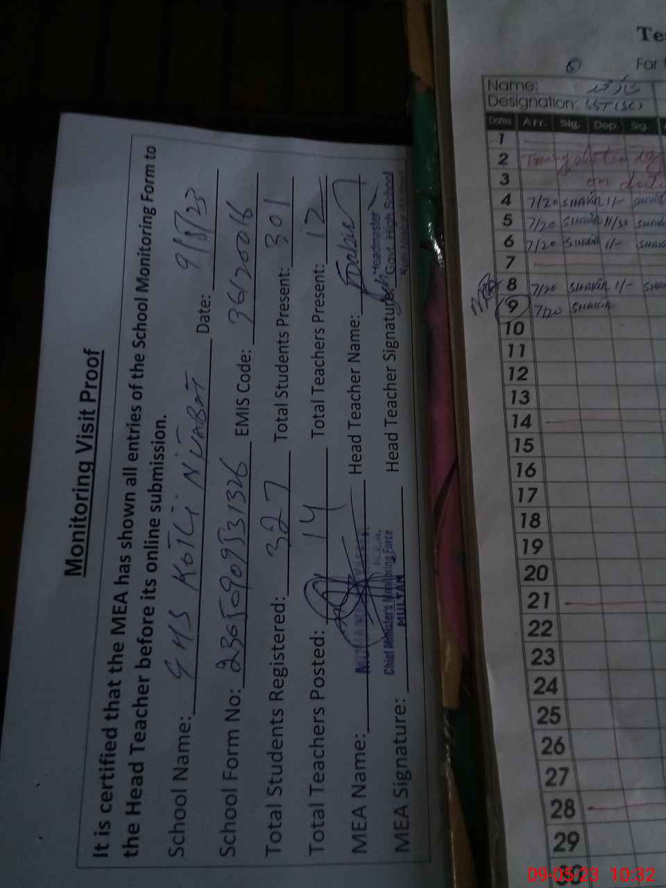 | Attendance Register | Head Teacher | MEA with School | Visit Proof |