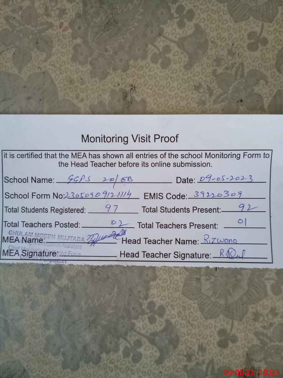 | Monitoring Date: 09-05-2023 | Start Time: 09-05-2023 09:11 AM | End Time: 09-05-2023 10:03 AM | Name of MEA: Gh**** Mu**** Mu**** (R**** | |