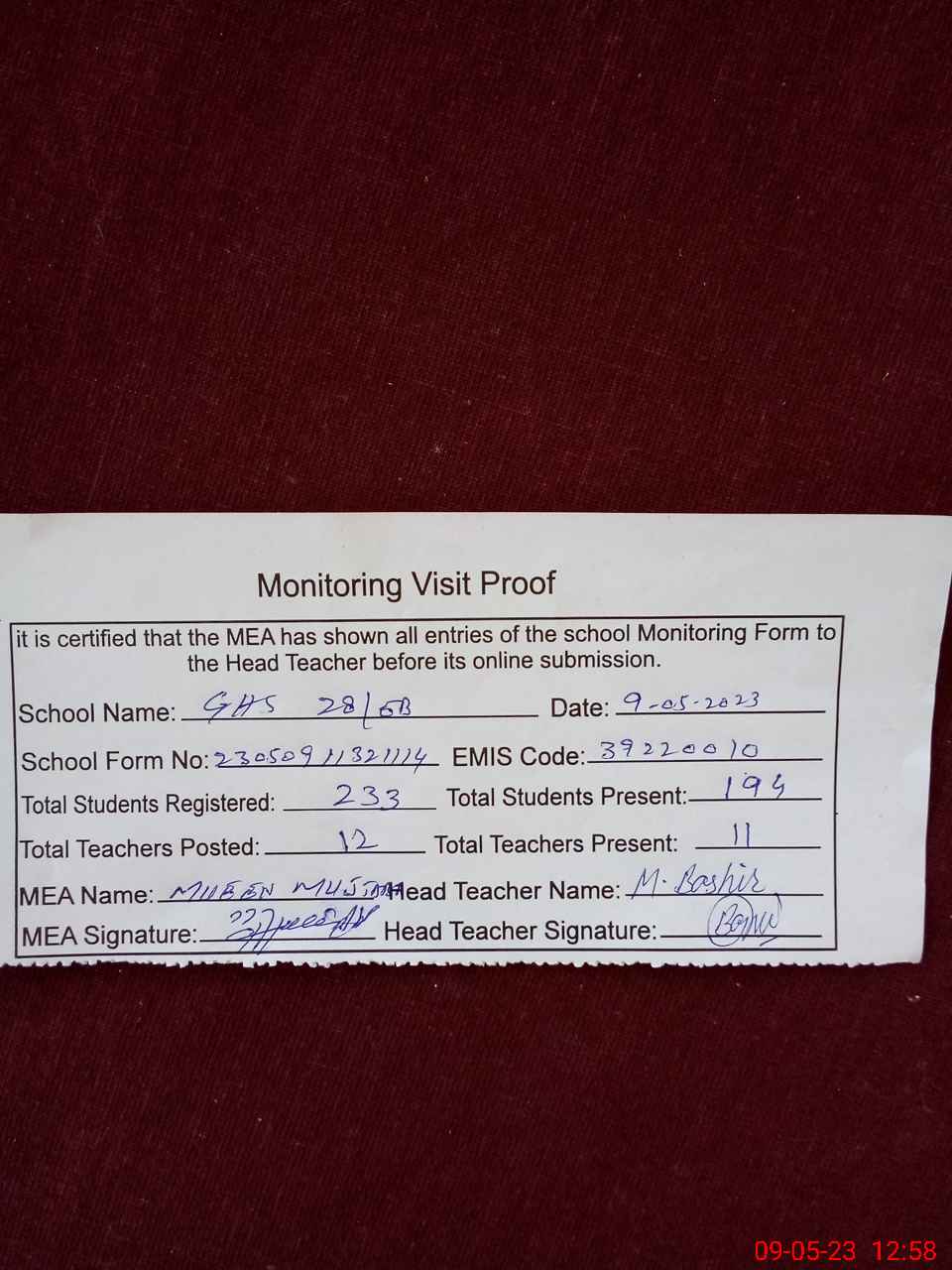 | Attendance Register | Head Teacher | MEA with School | Visit Proof |