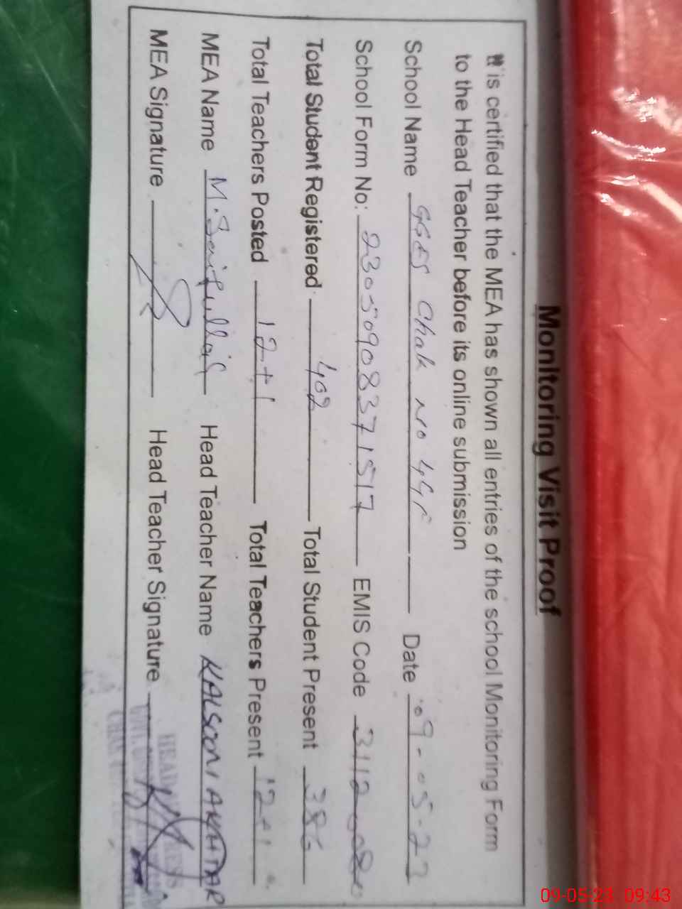 | Attendance Register | Head Teacher | MEA with School | Visit Proof |