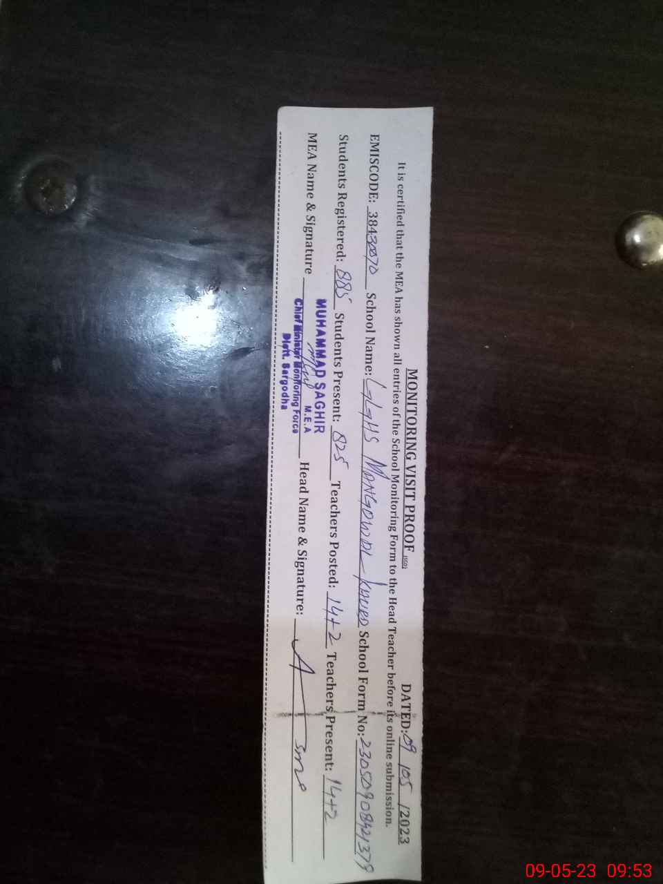 | Certified that this School was Inspected by the Undersigned MEA/DMO Today and the Information Stated Above is as Per Record. | |||||