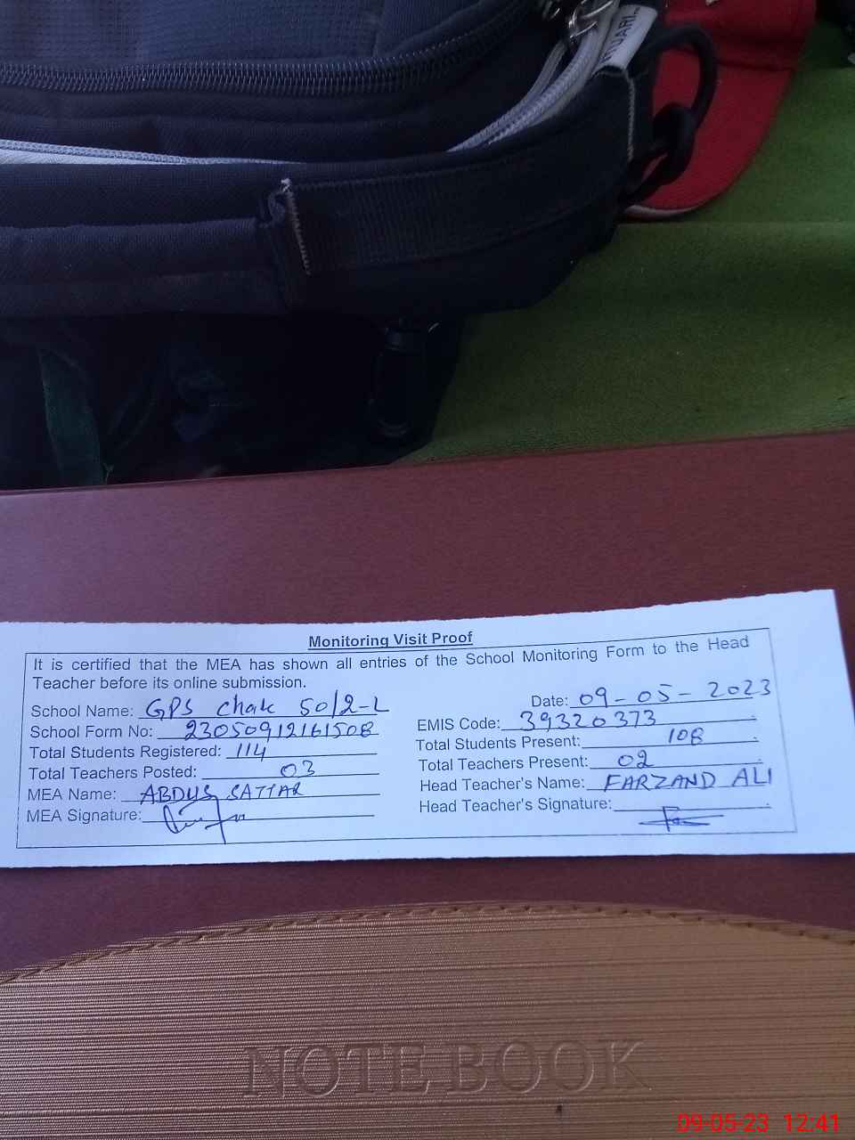 | Attendance Register | Head Teacher | MEA with School | Visit Proof |