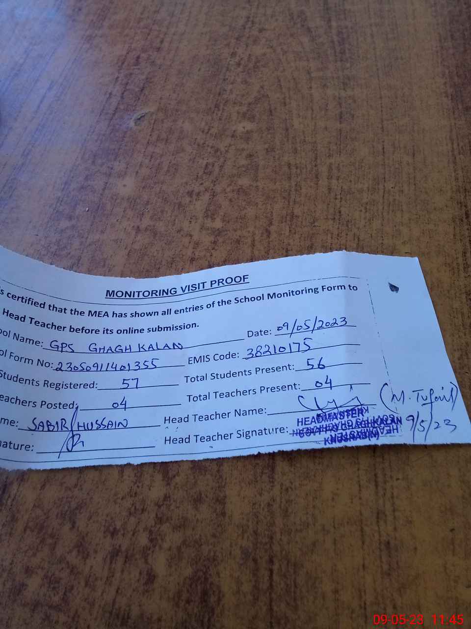 | Attendance Register | Head Teacher | MEA with School | Visit Proof |