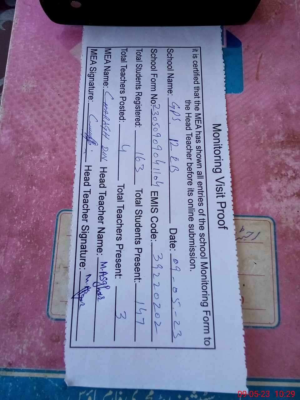 | Attendance Register | Head Teacher | MEA with School | Visit Proof |