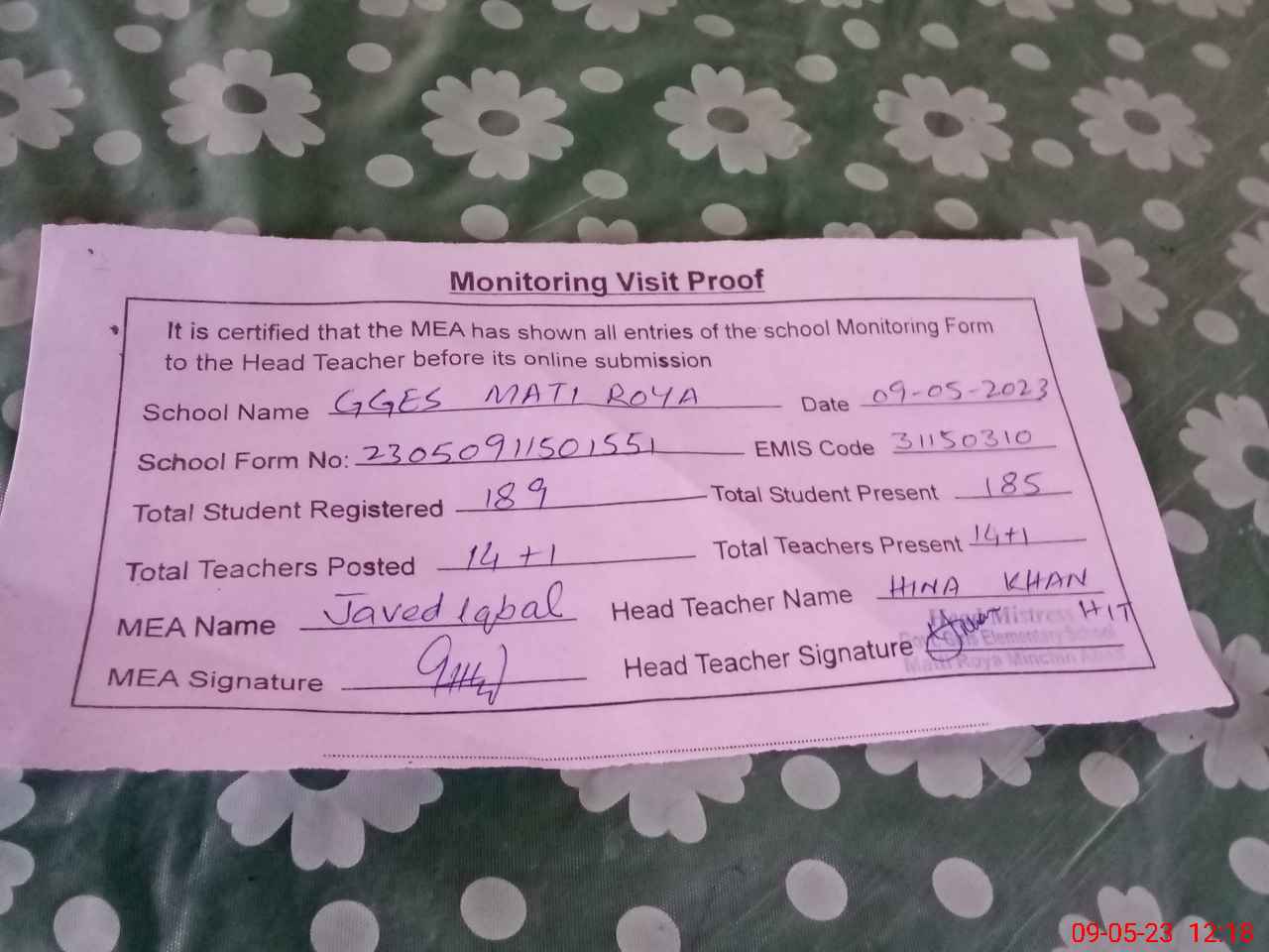 | Attendance Register | Head Teacher | MEA with School | Visit Proof |