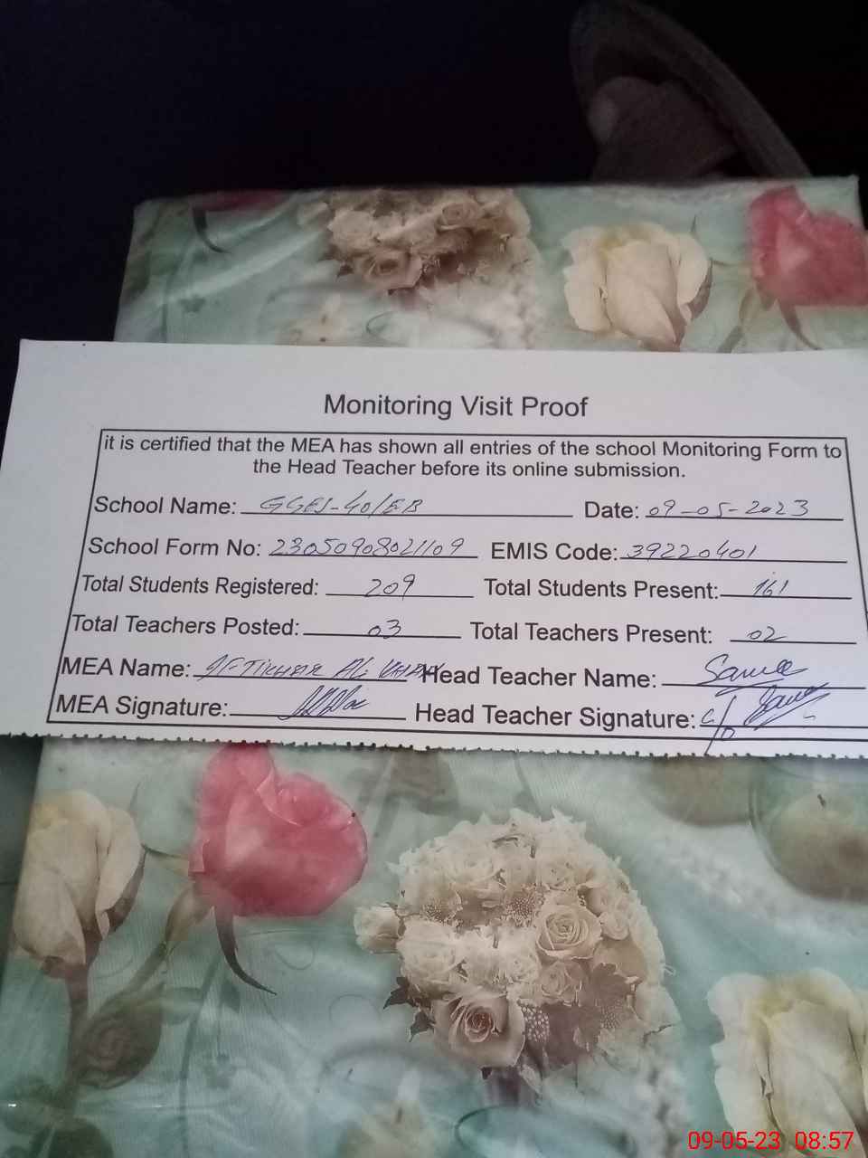| Attendance Register | Head Teacher | MEA with School | Visit Proof |