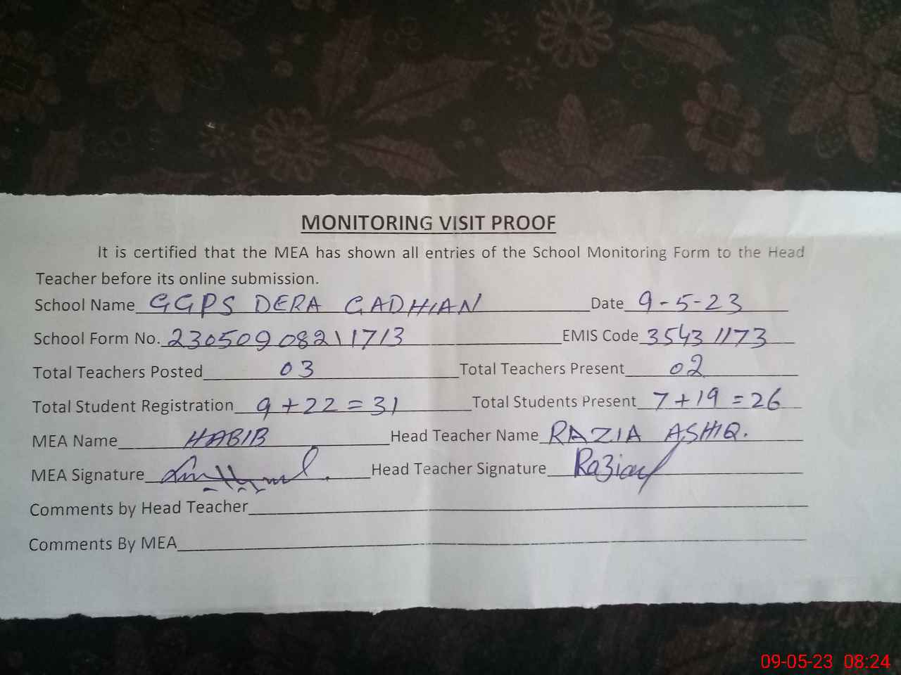 | Attendance Register | Head Teacher | MEA with School | Visit Proof |