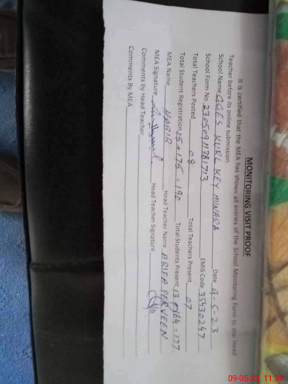 | Attendance Register | Head Teacher | MEA with School | Visit Proof |