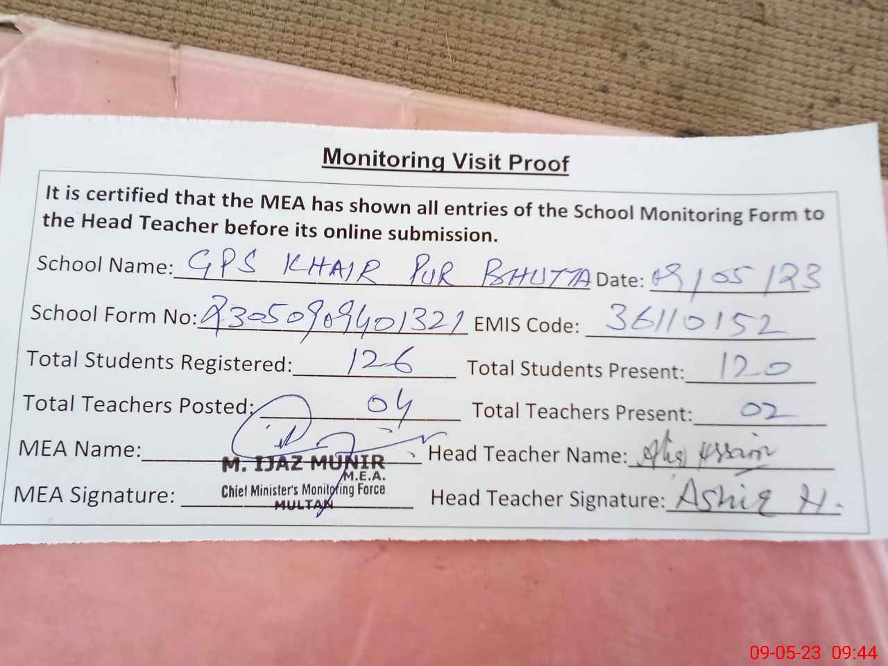 | EMIS Code: 36110152 | Name of School: GPS KHAIR PUR BHUTTA CANTT P/O QASIM BELLA | |||