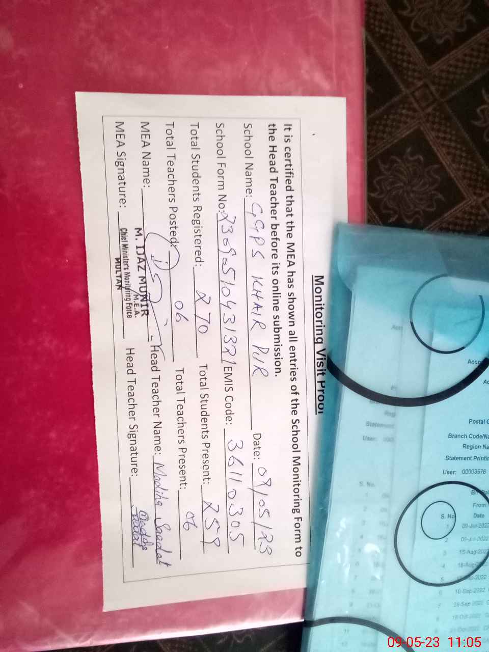 | Attendance Register | Head Teacher | MEA with School | Visit Proof |