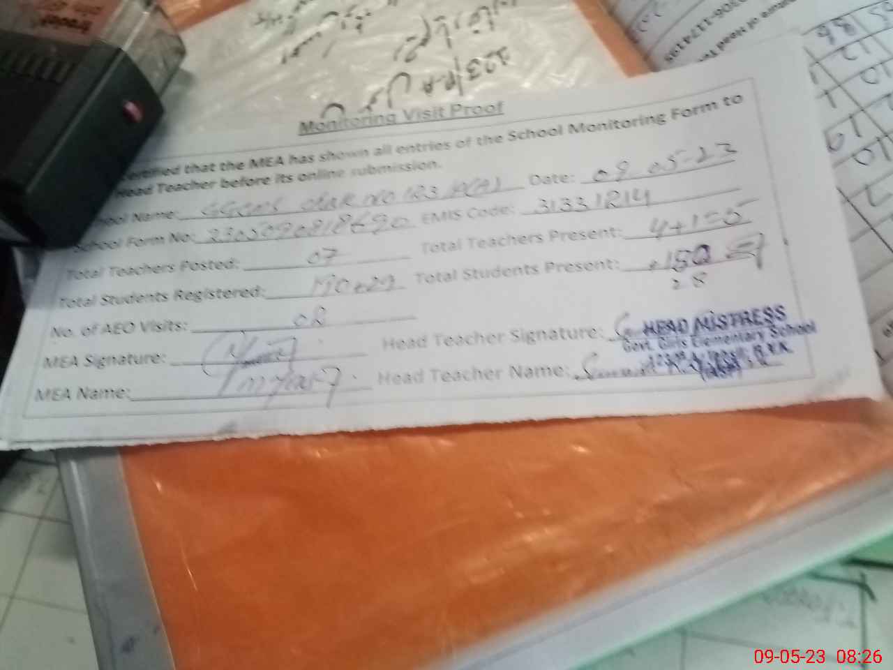 | Attendance Register | Head Teacher | MEA with School | Visit Proof |