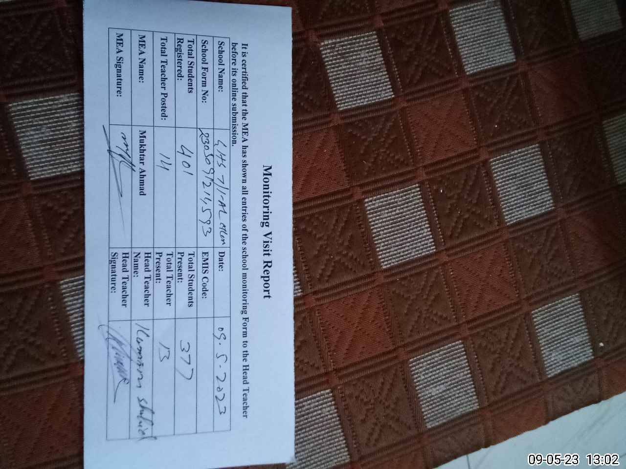 | Attendance Register | Head Teacher | MEA with School | Visit Proof |