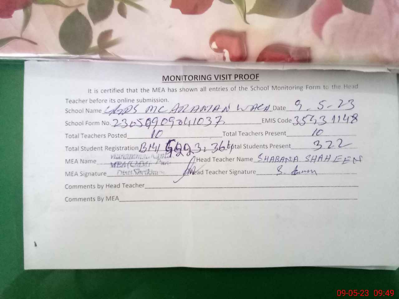 | Attendance Register | Head Teacher | MEA with School | Visit Proof |