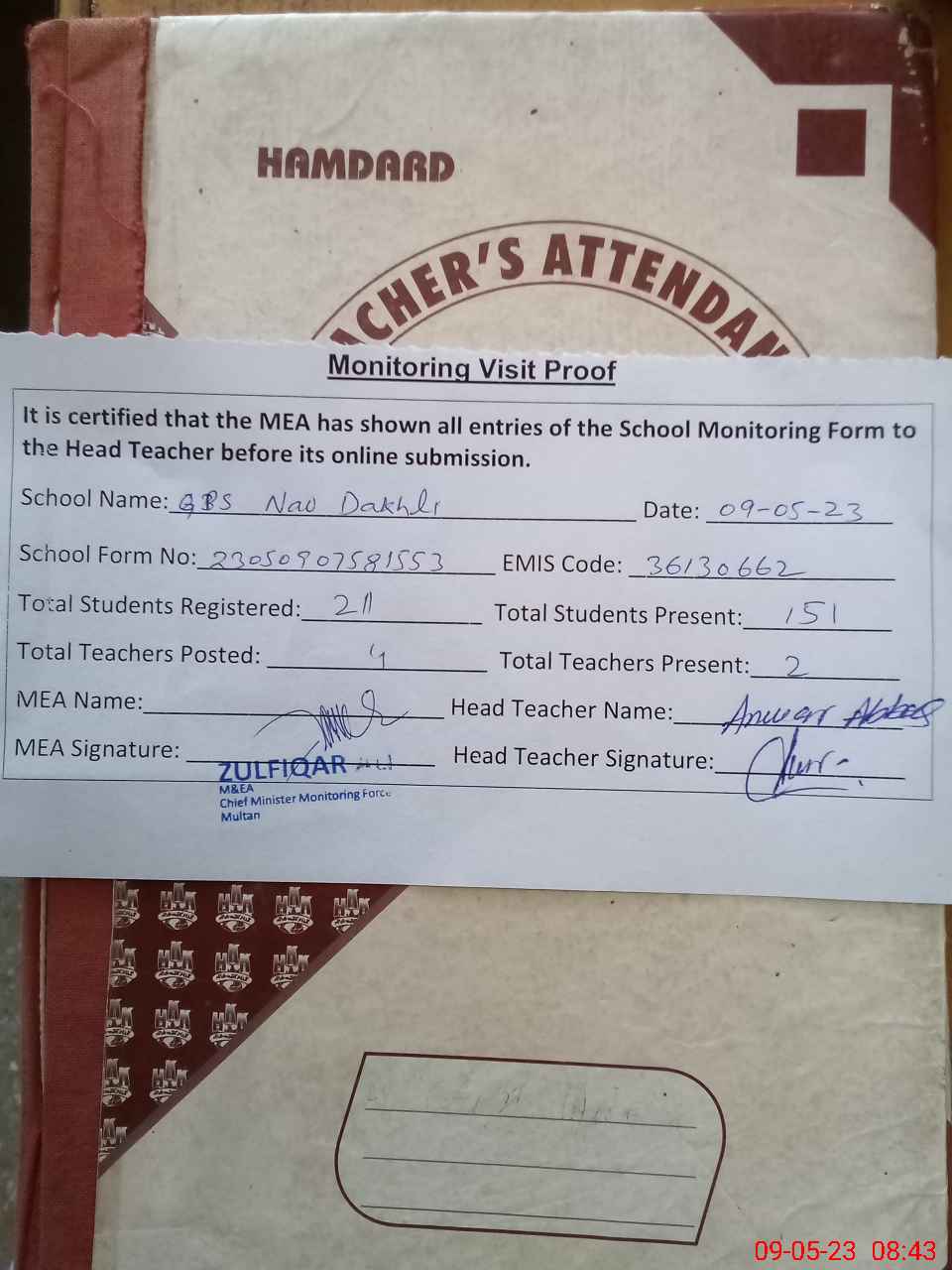 | Attendance Register | Head Teacher | MEA with School | Visit Proof |