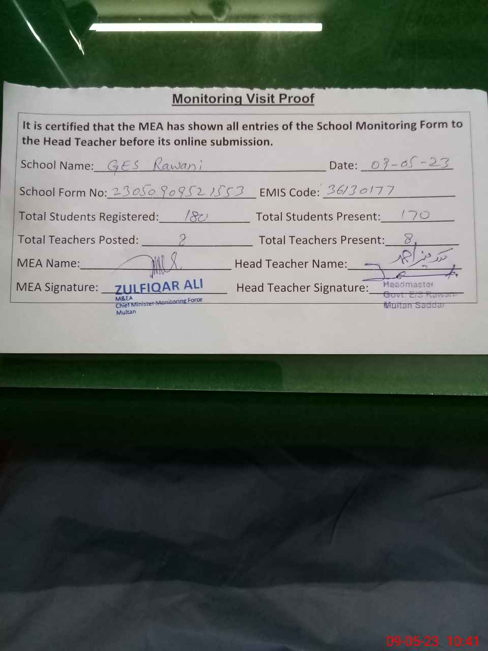 | Monitoring Date: 09-05-2023 | Start Time: 09-05-2023 09:52 AM | End Time: 09-05-2023 10:41 AM | Name of MEA: Zu**** Al**** | |