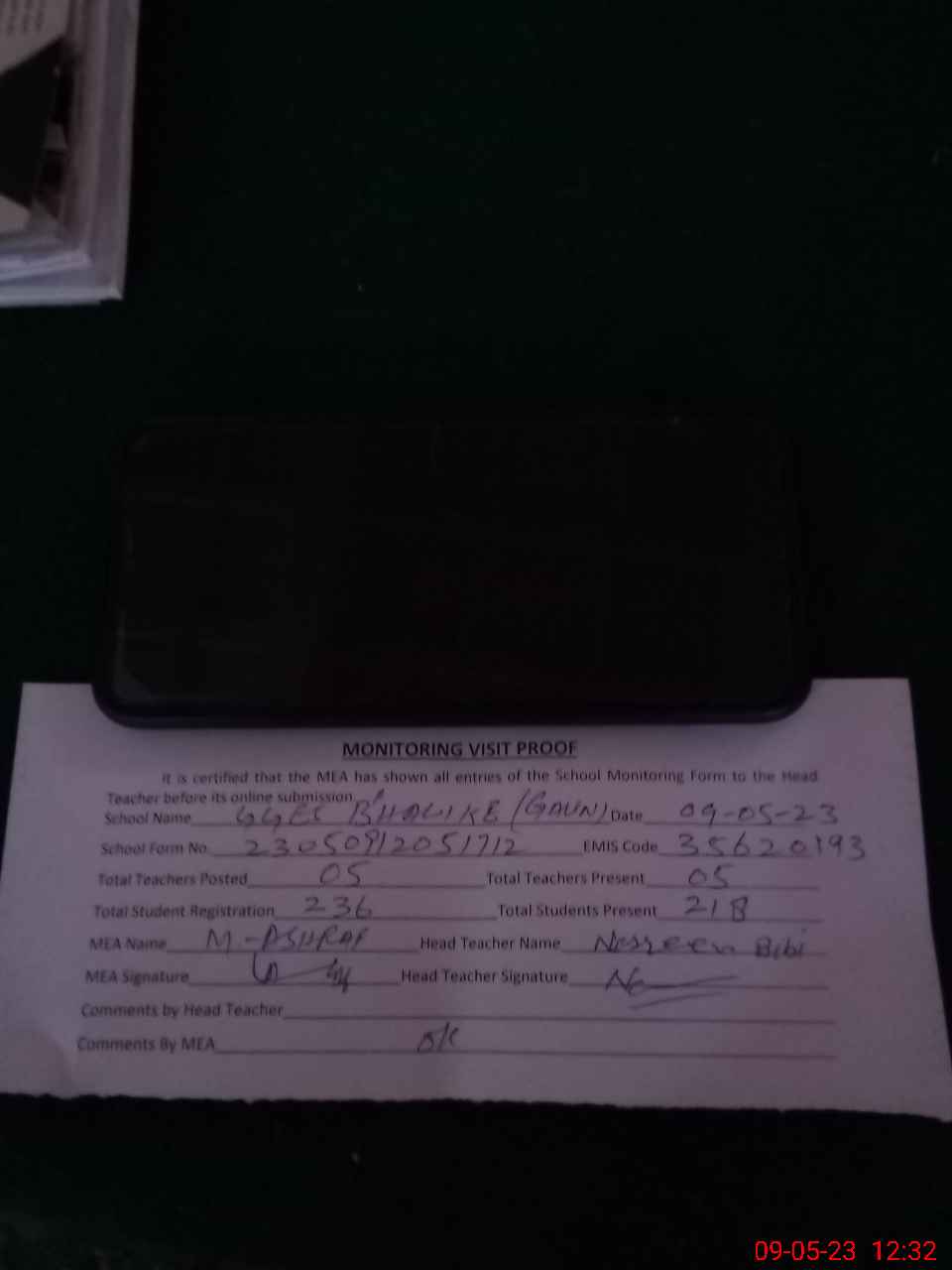 | Attendance Register | Head Teacher | MEA with School | Visit Proof |