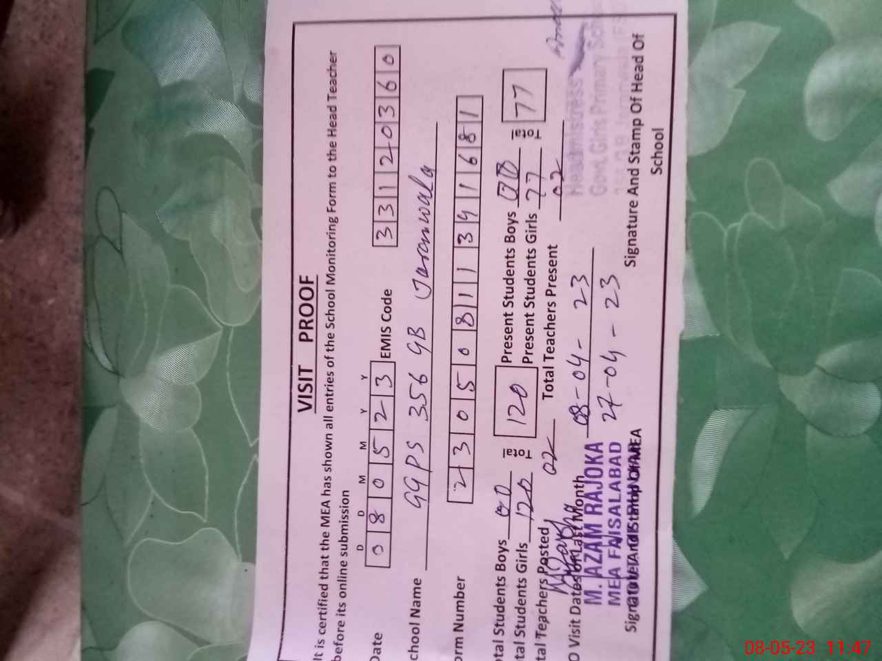 | Attendance Register | Head Teacher | MEA with School | Visit Proof |