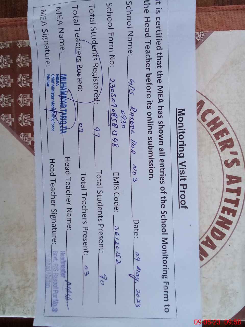 | Attendance Register | Head Teacher | MEA with School | Visit Proof |