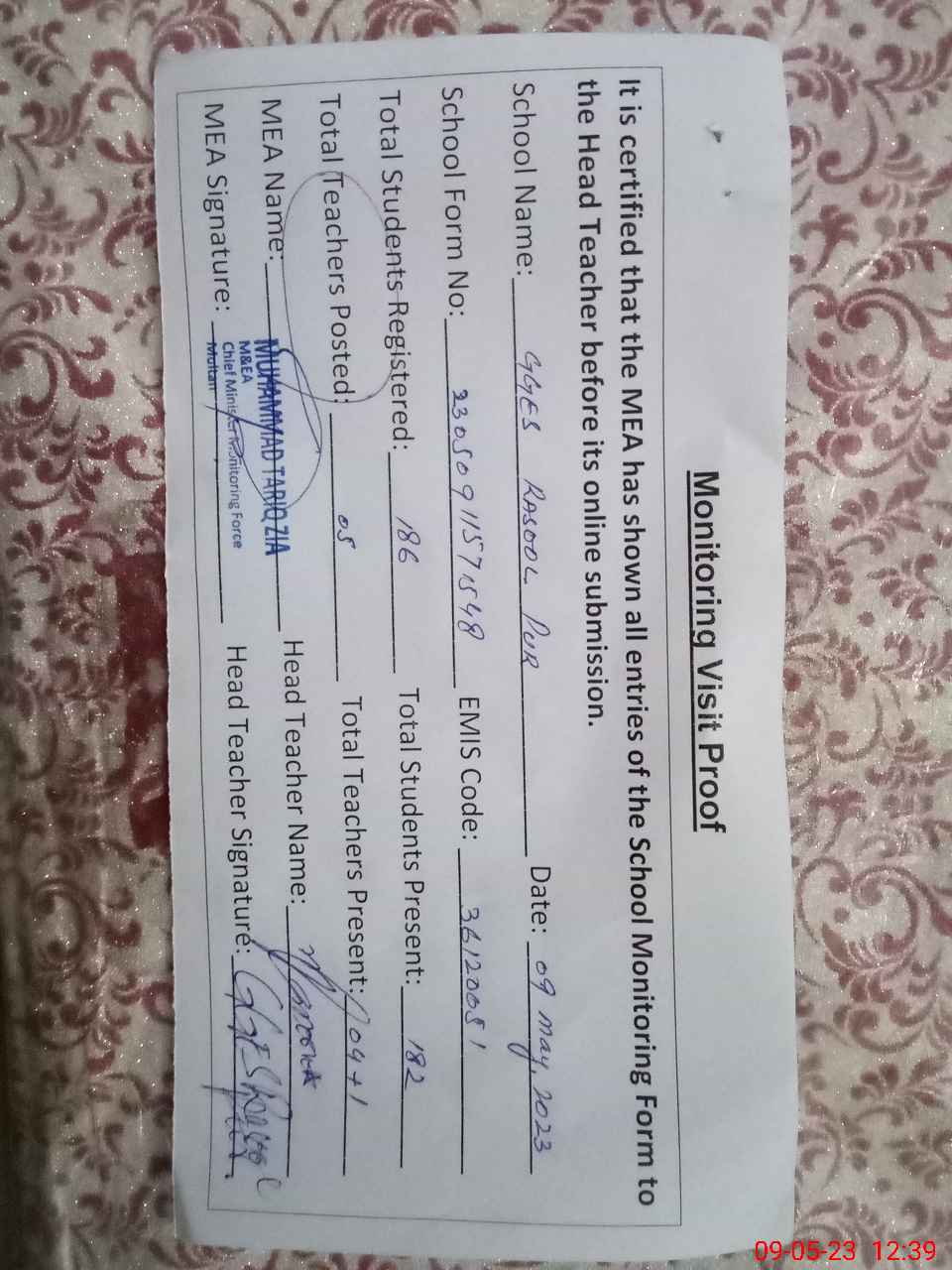 | Certified that this School was Inspected by the Undersigned MEA/DMO Today and the Information Stated Above is as Per Record. | |||||