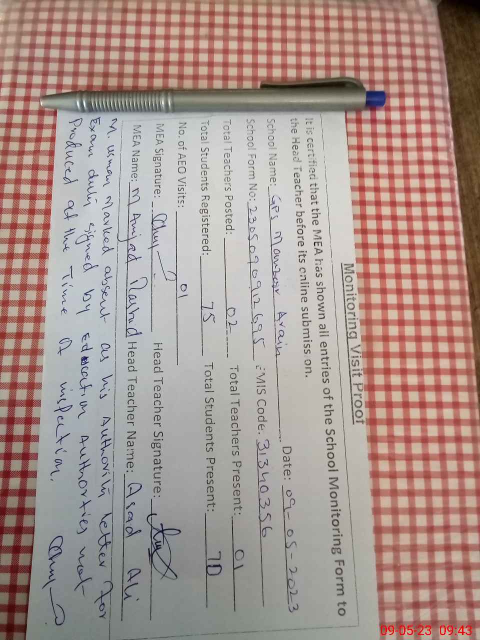 | Attendance Register | Head Teacher | MEA with School | Visit Proof |