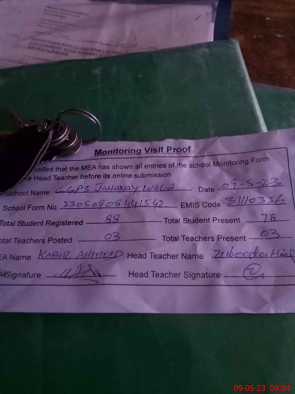 | Attendance Register | Head Teacher | MEA with School | Visit Proof |