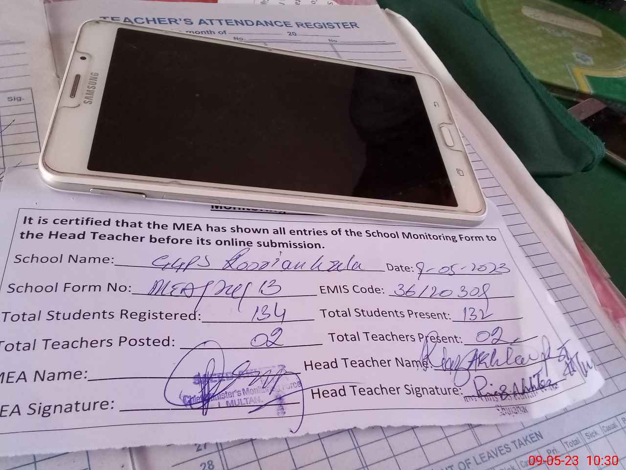 | Attendance Register | Head Teacher | MEA with School | Visit Proof |