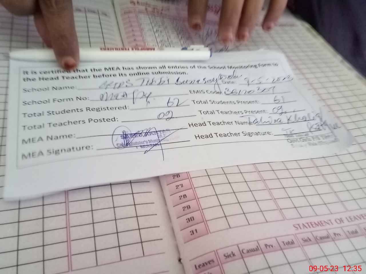 | Attendance Register | Head Teacher | MEA with School | Visit Proof |