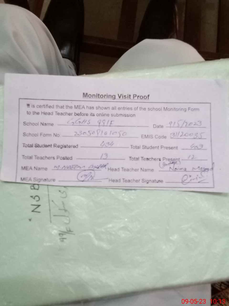 | Monitoring Date: 09-05-2023 | Start Time: 09-05-2023 09:41 AM | End Time: 09-05-2023 10:15 AM | Name of MEA: Mu**** Na**** Ak**** BN**** 31 | |
