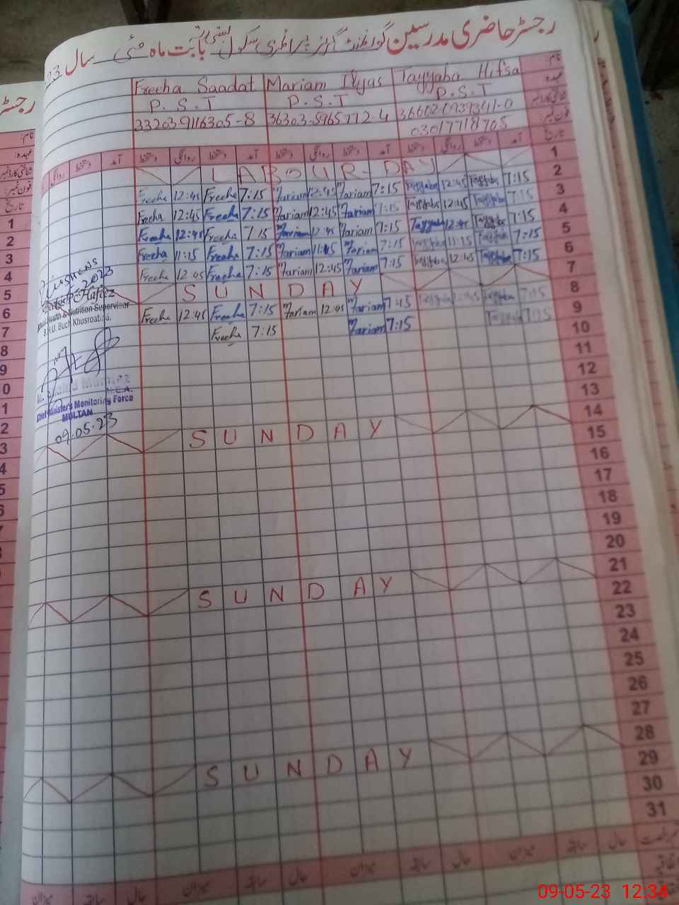 | Name: Ta**** Hi**** Designation: (School Headmaster's/Headmistress's) HEADMISTRESS Phone/Cell Number: 03**** |