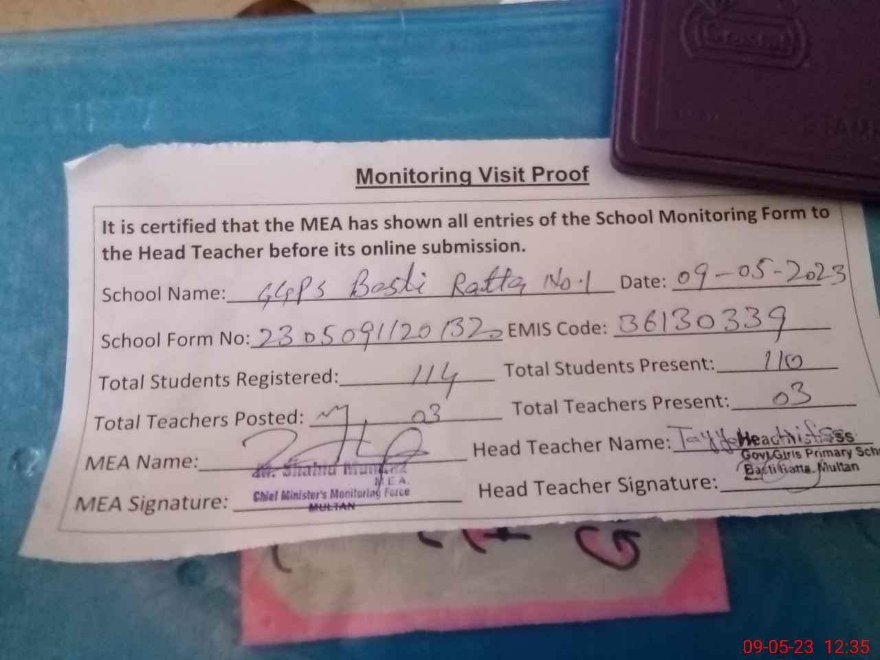 | Attendance Register | Head Teacher | MEA with School | Visit Proof |