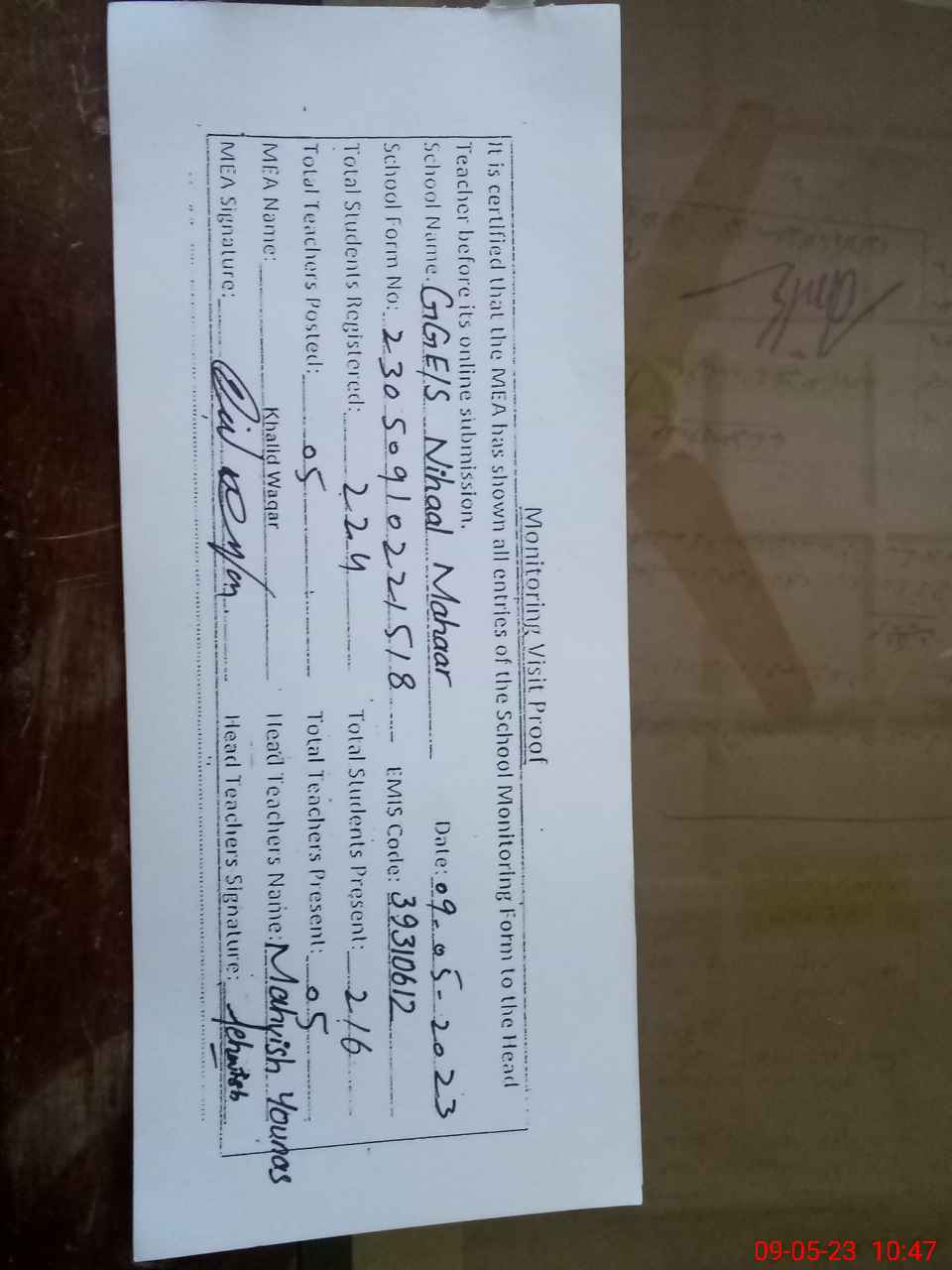 | Attendance Register | Head Teacher | MEA with School | Visit Proof |