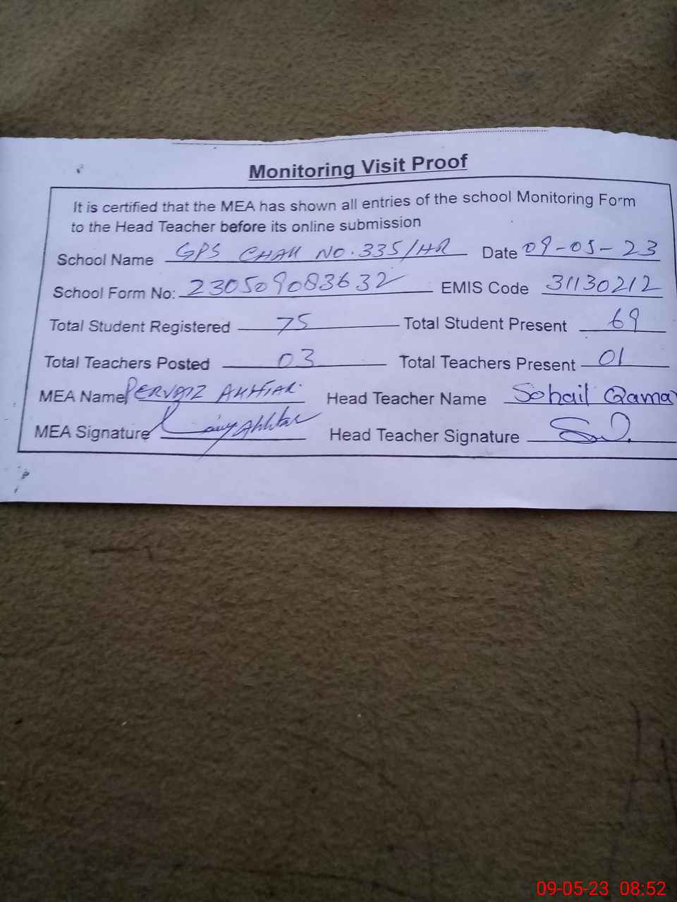 | EMIS Code: 31130212 | Name of School: GES CHAK NO 335/HR | |||