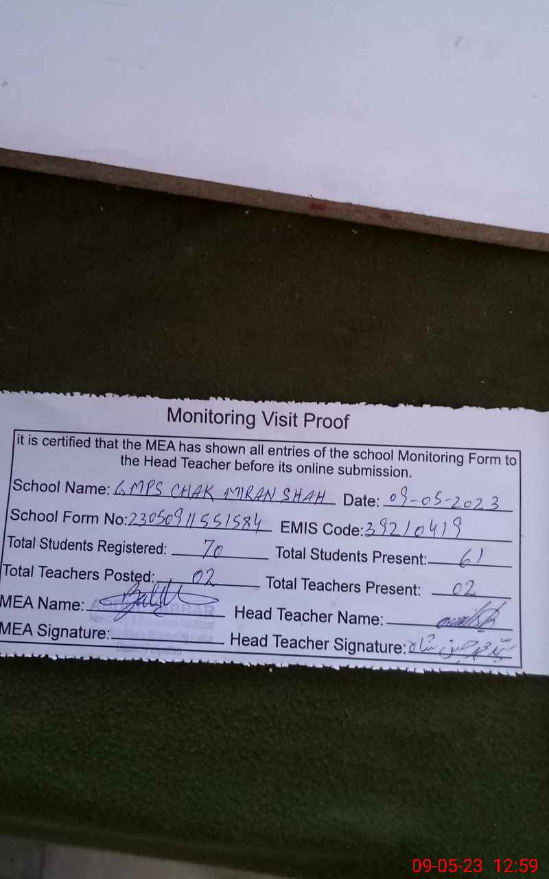 | EMIS Code: 39210419 | Name of School: GMPS CHAK MIRAN SHAH | |||