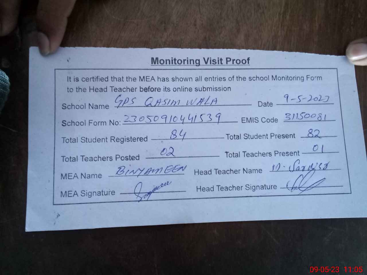 | EMIS Code: 31150081 | Name of School: GPS QASIM WALA | |||