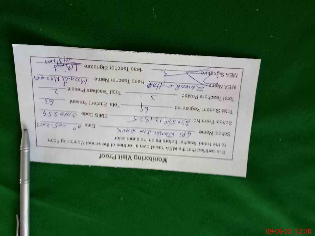 | Monitoring Date: 09-05-2023 | Start Time: 09-05-2023 12:12 PM | End Time: 09-05-2023 12:39 PM | Name of MEA: Za**** BN**** | |