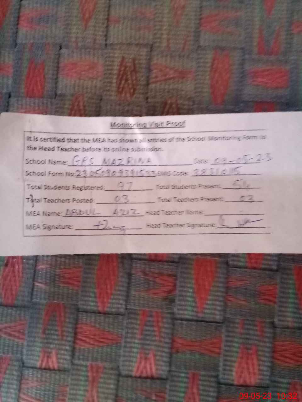 | Attendance Register | Head Teacher | MEA with School | Visit Proof |
