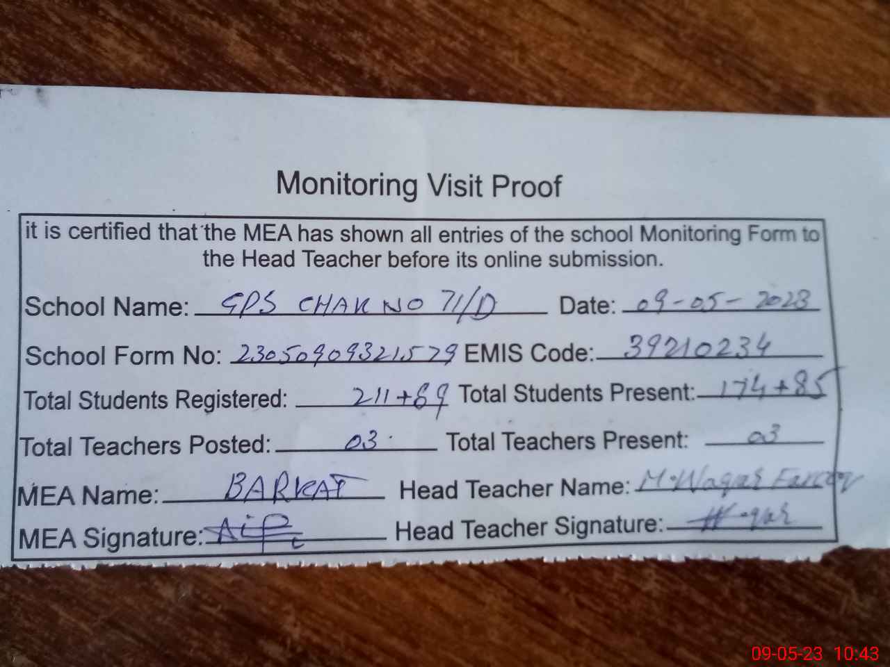 | Attendance Register | Head Teacher | MEA with School | Visit Proof |