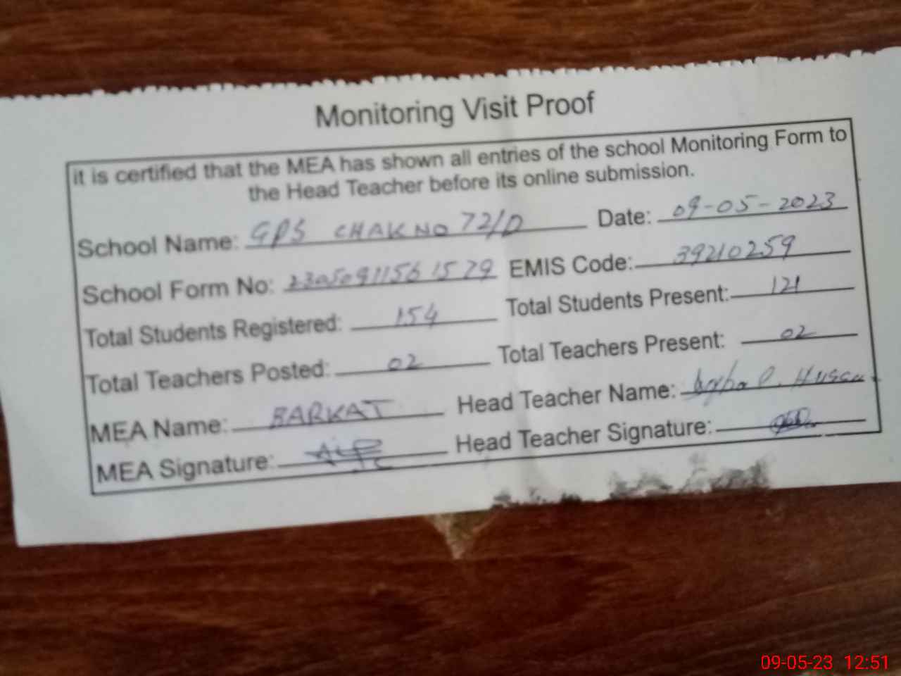 | Attendance Register | Head Teacher | MEA with School | Visit Proof |