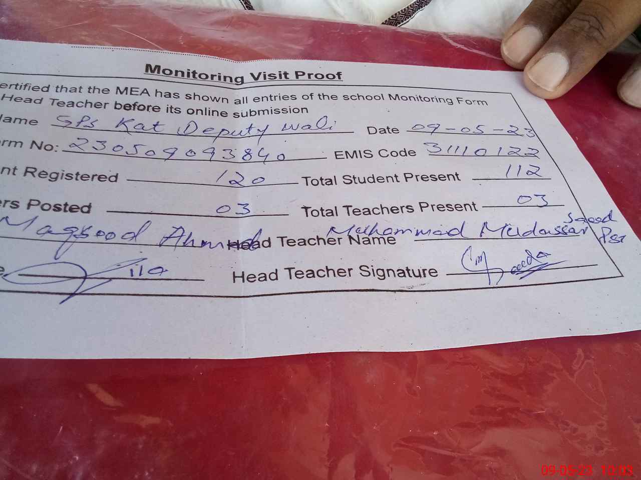 | Attendance Register | Head Teacher | MEA with School | Visit Proof |