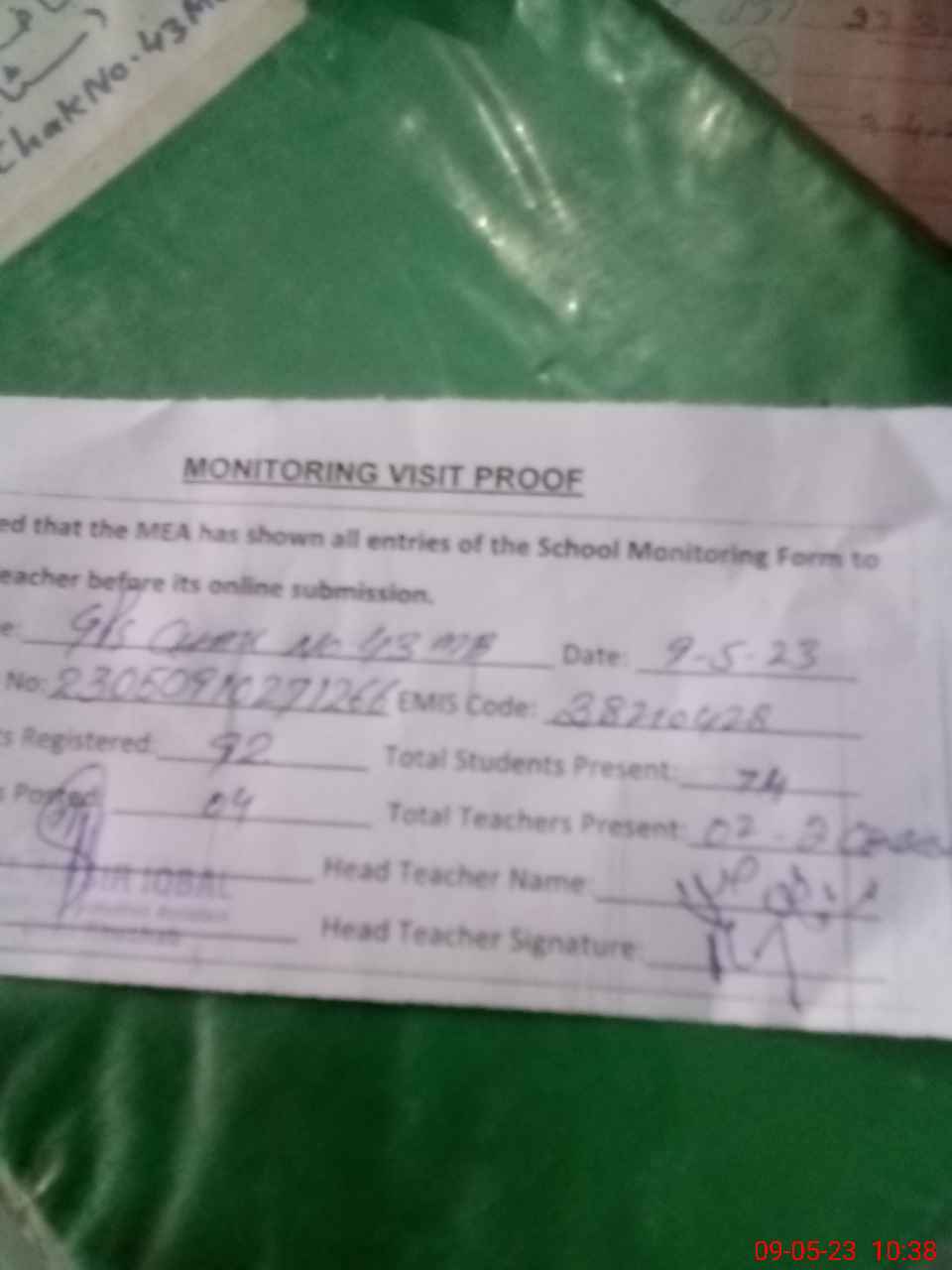 | EMIS Code: 38210428 | Name of School: GPS CHAK NO. 43 MB | |||