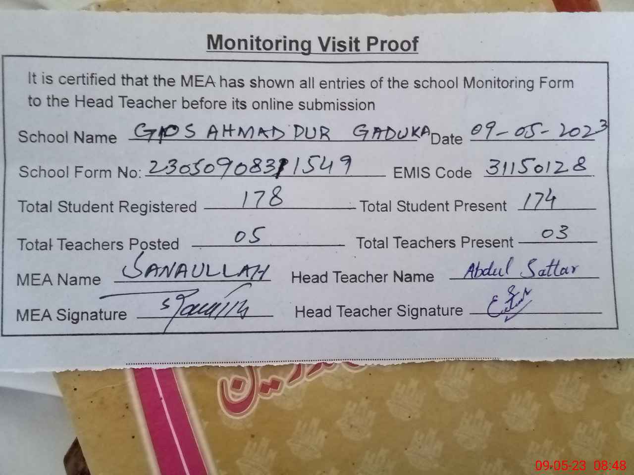| Attendance Register | Head Teacher | MEA with School | Visit Proof |