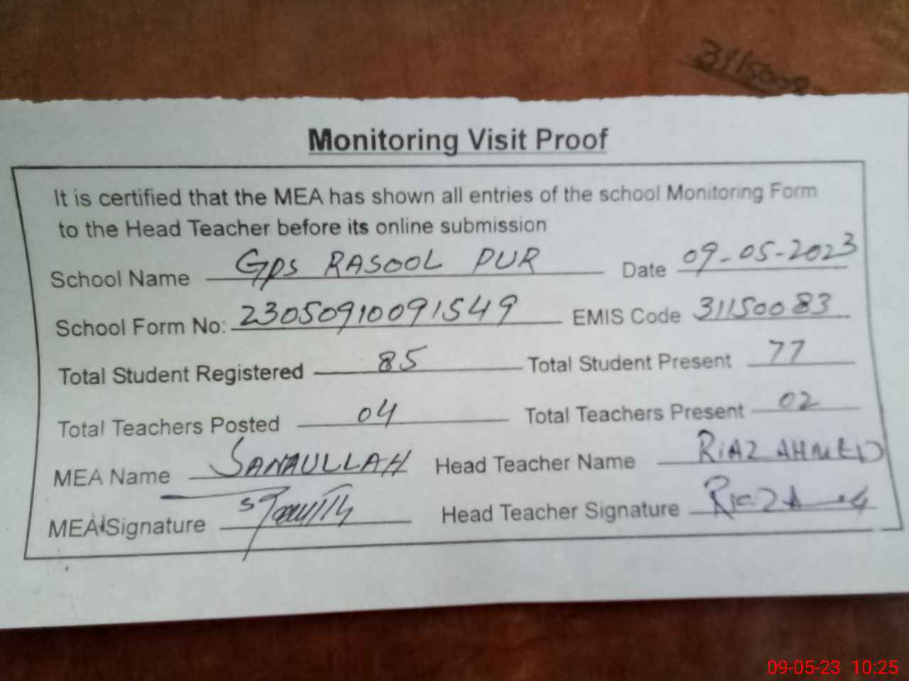| Attendance Register | Head Teacher | MEA with School | Visit Proof |