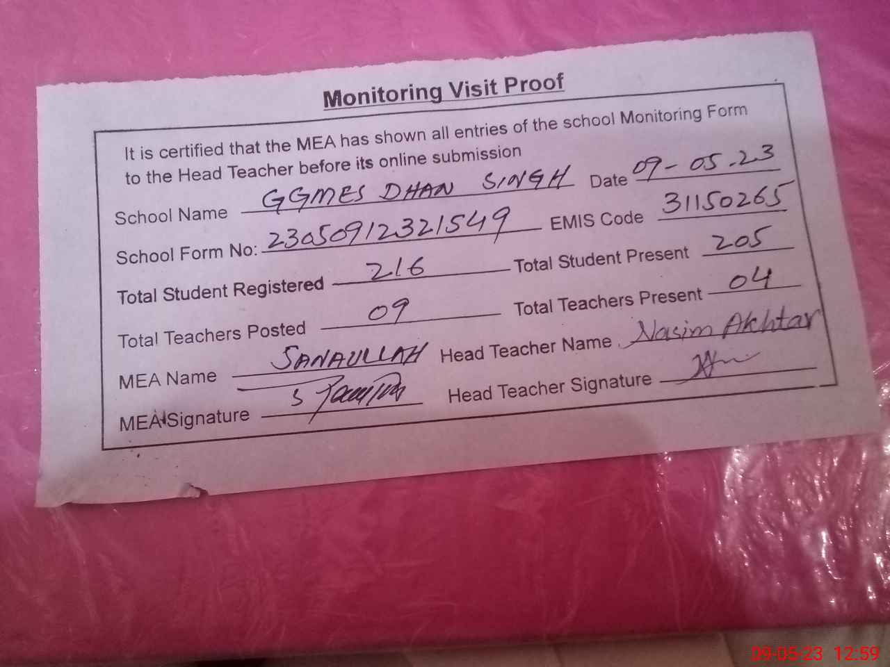 | Attendance Register | Head Teacher | MEA with School | Visit Proof |
