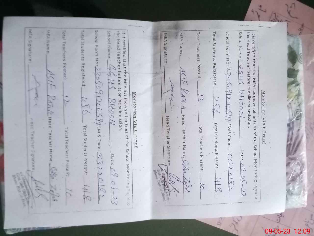 | Attendance Register | Head Teacher | MEA with School | Visit Proof |