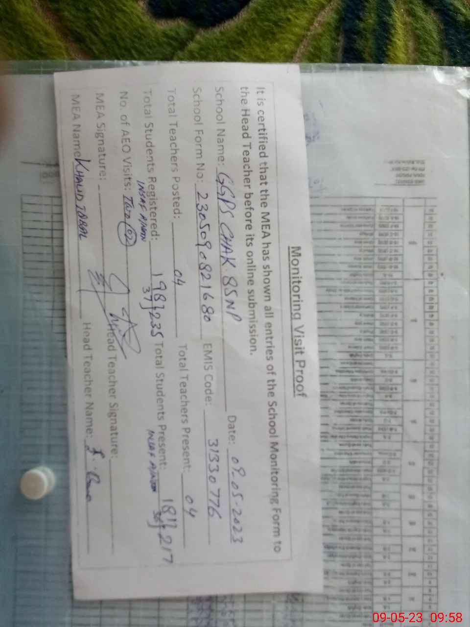 | Attendance Register | Head Teacher | MEA with School | Visit Proof |